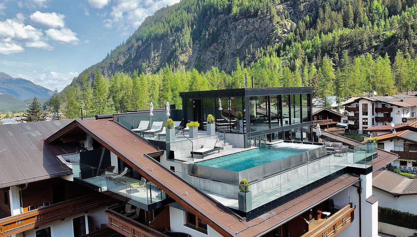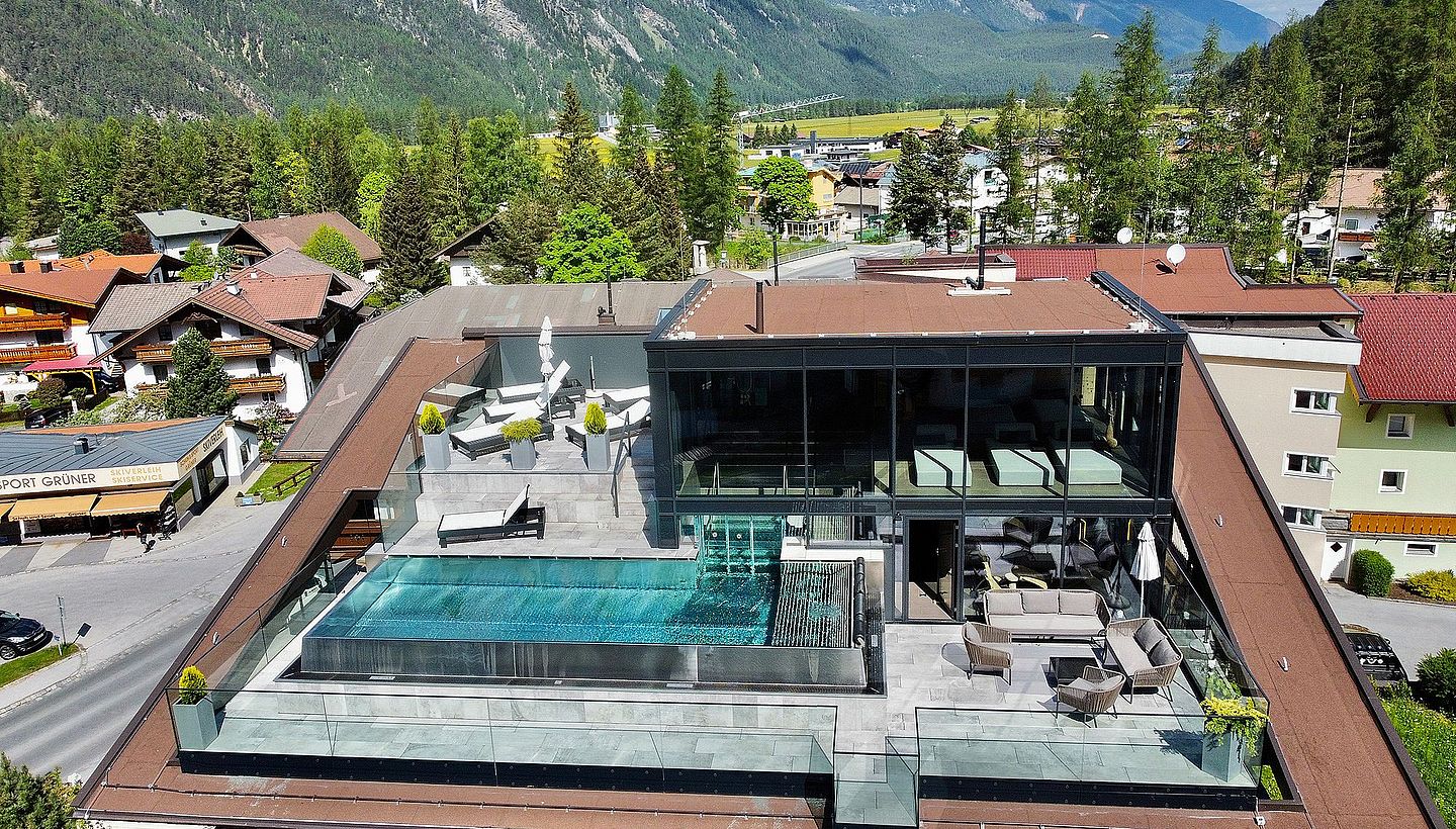 Poolstyle realised a modern wellness highlight for the traditional Hotel Stern in Ötztal: a spacious infinity pool on the top floor with an impressive panoramic view of the Alpine landscape. The two-storey wellness area has an open-plan design: Upstairs, a relaxation area invites you to unwind, while the pool is located downstairs, combining maximum comfort with a relaxed atmosphere. Clear shapes, natural materials and a harmonious overall appearance create an exclusive spa experience that perfectly complements the hotel's existing wellness facilities.